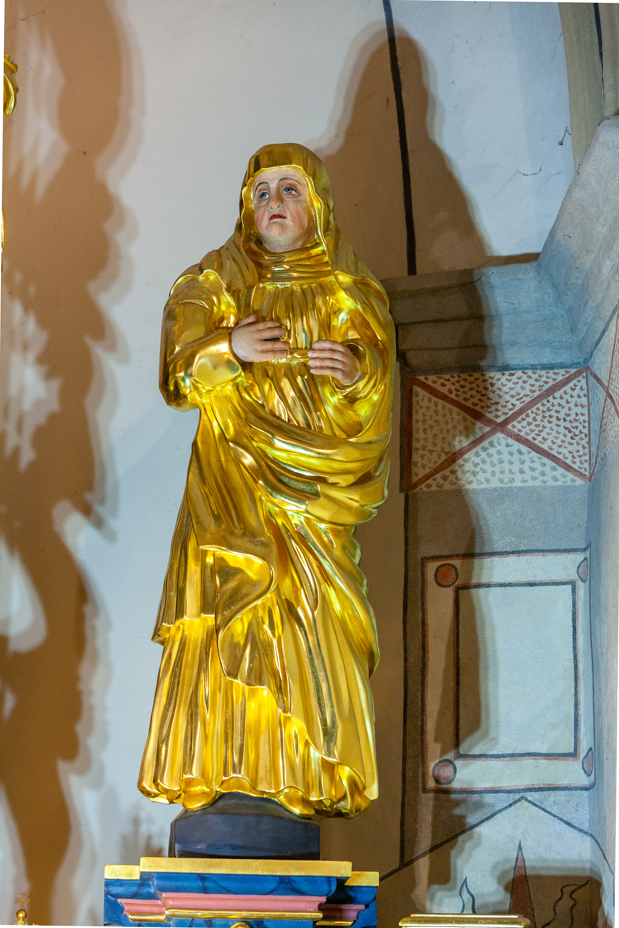 A. Statue of St Anna, frontal position, head slightly turned to the left, right hand bend positioned on the chest, left hand in front. On the floor length dress a tunic tied with a belt. A coat, falling from the shoulders on the left side held by the right hand. A scarf around the neck, head covered with veil falling on the forehead. Statues’ robes are gold-plated, parts of faces and hands matted with white.