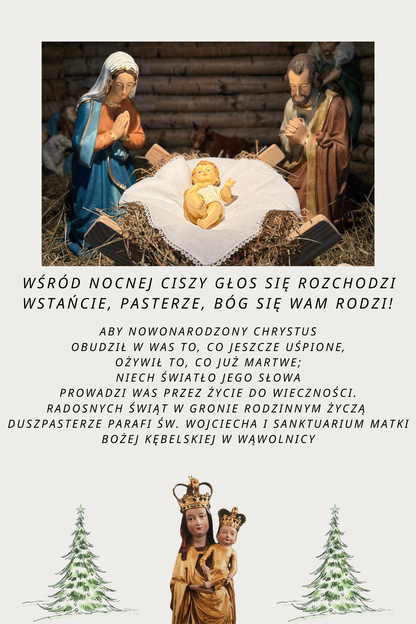 • Pasterka o północy będzie sprawowana w intencji Parafian i Pielgrzymów. Po Mszy św. pasterskiej zapraszamy na kolędowanie w bazylice. W Niezabitowie Pasterka o godz. 22.00. Ofiary zebrane na tacę w Pasterkę będą przeznaczone na Fundusz Obrony Życia.
